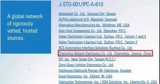 博康電子的生產(chǎn)工藝與產(chǎn)品質(zhì)量,完全符合電子行業(yè)國(guó)際標(biāo)準(zhǔn)IPC J-STD-001《焊接的電氣與電子組件要求》與IPC-A-610《電子組件的可接受性》三級(jí)產(chǎn)品要求,意味著該公司生產(chǎn)的電子組件具有很高的可靠性和一致性。因此,作為電子行業(yè)的最佳實(shí)踐典范,該公司被列入IPC QML/QPL全球可信資源庫,在線查詢:www.ipcvalidation.org。